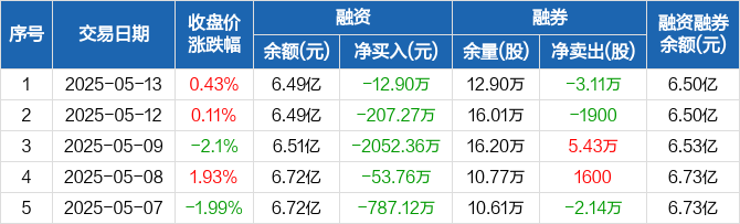 融资方面,当日融资买入1037.29万元,融资偿还1050.18万元,融资净偿还12.9万元,连续9日净偿还累计4958.48万元。融券方面,融券卖出1万股,融券偿还4.11万股,融券余量12.9万股,融券余额121万元。融资融券余额合计6.5亿元。