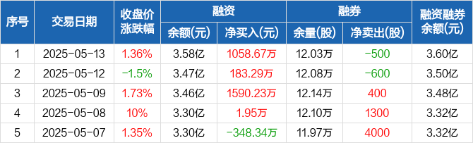 融资方面,当日融资买入4043.91万元,融资偿还2985.25万元,融资净买入1058.67万元,连续4日净买入累计2834.13万元。融券方面,融券卖出1700股,融券偿还2200股,融券余量12.03万股,融券余额232.54万元。融资融券余额合计3.6亿元。