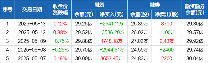融资方面,当日融资买入5849.11万元,融资偿还8490.22万元,融资净偿还2641.11万元。融券方面,融券卖出2.3万股,融券偿还1.43万股,融券余量26.89万股,融券余额433.2万元。融资融券余额合计29.3亿元。