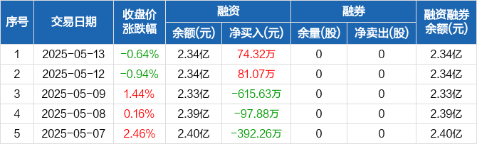 融资方面,当日融资买入558.13万元,融资偿还483.81万元,融资净买入74.32万元。融券方面,融券卖出0股,融券偿还0股,融券余量0股,融券余额0元。融资融券余额合计2.34亿元。