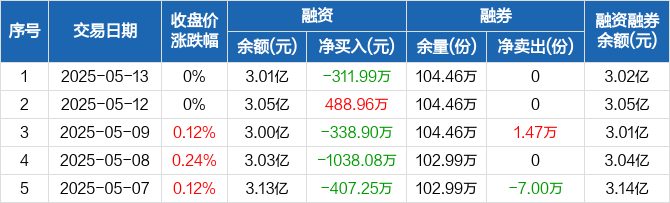 融资方面,当日融资买入1214.88万元,融资偿还1526.87万元,融资净偿还311.99万元。融券方面,融券卖出0份,融券偿还0份,融券余量104.46万份,融券余额85.97万元。融资融券余额合计3.02亿元。