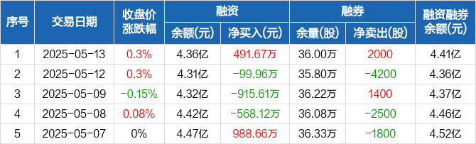 融资方面,当日融资买入1587.34万元,融资偿还1095.67万元,融资净买入491.67万元。融券方面,融券卖出2500股,融券偿还500股,融券余量36万股,融券余额475.88万元。融资融券余额合计4.41亿元。