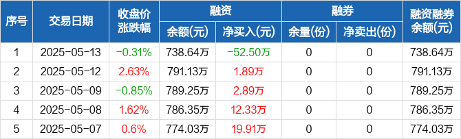 融资方面,当日融资买入21.81万元,融资偿还74.3万元,融资净偿还52.5万元。融券方面,融券卖出0份,融券偿还0份,融券余量0份,融券余额0元。融资融券余额合计738.64万元。