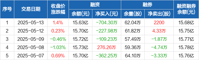 融资方面,当日融资买入1143.7万元,融资偿还1848万元,融资净偿还704.3万元,连续3日净偿还累计1041.51万元。融券方面,融券卖出3.01万股,融券偿还2.79万股,融券余量62.04万股,融券余额540.37万元。融资融券余额合计15.68亿元。