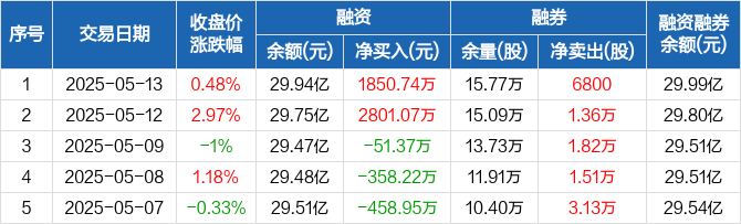 融资方面,当日融资买入8492.78万元,融资偿还6642.04万元,融资净买入1850.74万元。融券方面,融券卖出9100股,融券偿还2300股,融券余量15.77万股,融券余额500.32万元。融资融券余额合计29.99亿元。