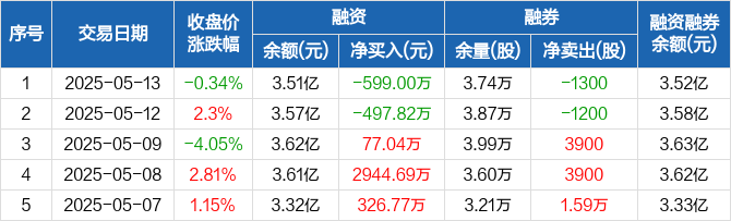 融资方面,当日融资买入3541.97万元,融资偿还4140.97万元,融资净偿还599万元。融券方面,融券卖出2200股,融券偿还3500股,融券余量3.74万股,融券余额119.24万元。融资融券余额合计3.52亿元。