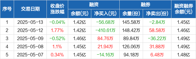 融资方面,当日融资买入272.25万元,融资偿还328.93万元,融资净偿还56.68万元。融券方面,融券卖出3.72万份,融券偿还6.56万份,融券余量145.58万份,融券余额393.07万元。融资融券余额合计1.45亿元。