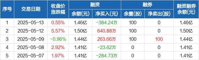 绿通科技融资融券信息显示,2025年5月13日融资净偿还384.24万元;融资余额1.46亿元,较前一日下降2.56%。