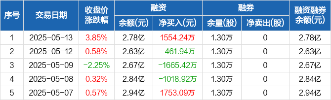 融资方面,当日融资买入5455.38万元,融资偿还3901.14万元,融资净买入1554.24万元。融券方面,融券卖出0股,融券偿还0股,融券余量1.3万股,融券余额16.5万元。融资融券余额合计2.78亿元。