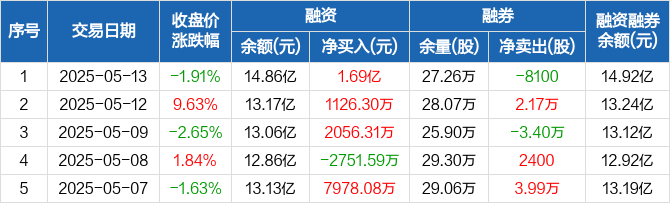 蓝思科技融资融券信息显示,2025年5月13日融资净买入1.69亿元;融资余额14.86亿元,较前一日增加12.8%。