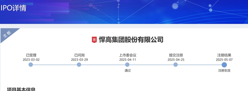 公开报道显示,2022年7月,悍高集团首次向深交所主板递交招股书。2023年初,悍高集团上市申请获受理,同年3月底被问询。监管层下发意见函要求悍高集团说明内外关联交易、销售模式合理性等问题。此后其又遇到财务资料过期等问题。2025年4月11日,悍高集团通过深交所主板上市委会议。4月25日,悍高集团提交注册申请。5月7日,悍高集团主板IPO注册获批。