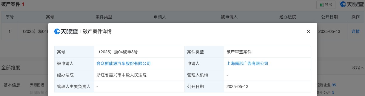 5月14日,《每日经济新闻》记者查阅天眼查App发现,哪吒汽车母公司合众新能源汽车股份有限公司新增了一条破产审查案件,申请人为上海禹形广告有限公司。该破产审查案件公开日期为5月13日,经办法院为浙江省嘉兴市中级人民法院。