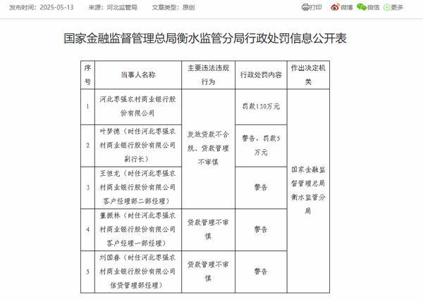 中国网财经5月14日讯昨日,国家金融监督管理总局衡水监管分局行政处罚信息公开表显示,河北枣强农村商业银行因发放贷款不合规、贷款管理不审慎,被罚款130万元。