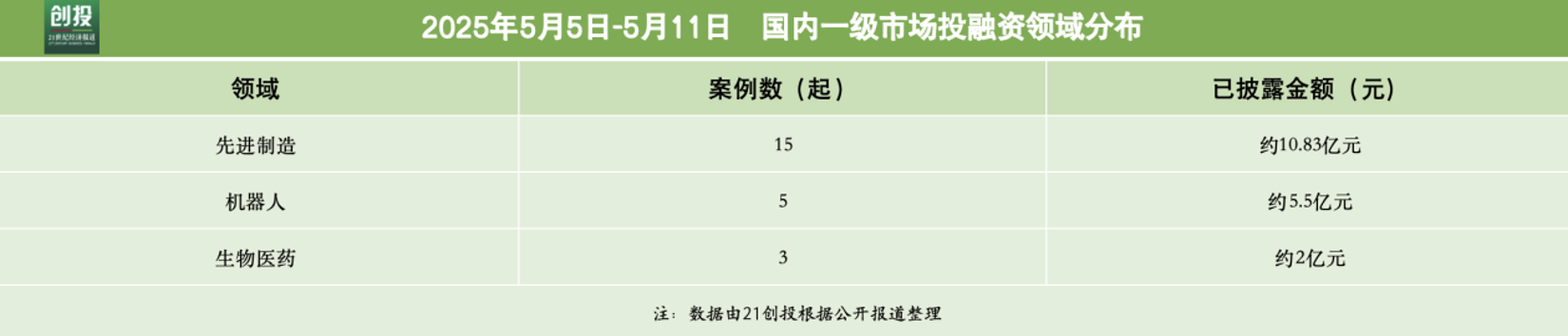 本周融资数量最多的依旧是科技与制造行业。在行业领域的诸多赛道中,先进制造完成15笔融资,披露融资额约10.83亿元人民币;机器人完成5笔融资,赛道披露融资金额超5.5亿元人民币。生物医药赛道完成3笔融资,披露融资金额超2亿元人民币。
