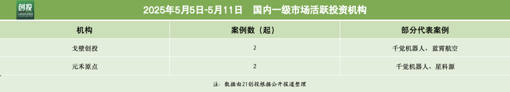 从机构投资活跃度来看,本周戈壁创投披露2笔投资,元禾原点披露2笔投资。其中,千觉机器人为两家机构的共同投资对象。