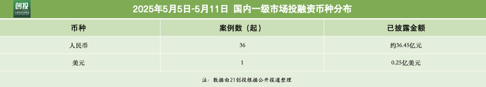 21创投不完全统计,5月5日—5月11日,报告日期内国内一级市场发生融资事件37起。其中,有32笔融资披露了融资金额和币种信息,总规模超人民币38.26亿元。