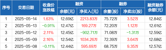 融资方面,当日融资买入1.04亿元,融资偿还8155.86万元,融资净买入2213.83万元。融券方面,融券卖出3.52万股,融券偿还0股,融券余量75.72万股,融券余额1509.86万元。融资融券余额合计12.84亿元。