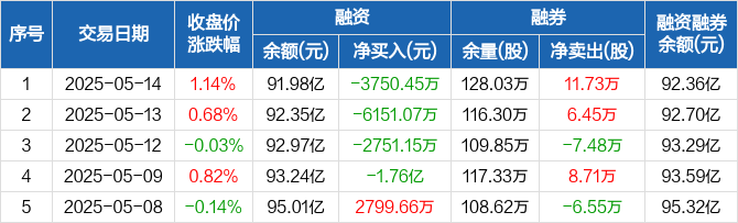 融资方面,当日融资买入1.04亿元,融资偿还1.42亿元,融资净偿还3750.45万元,连续4日净偿还累计3.03亿元。融券方面,融券卖出14.93万股,融券偿还3.2万股,融券余量128.03万股,融券余额3851.14万元。融资融券余额合计92.36亿元。