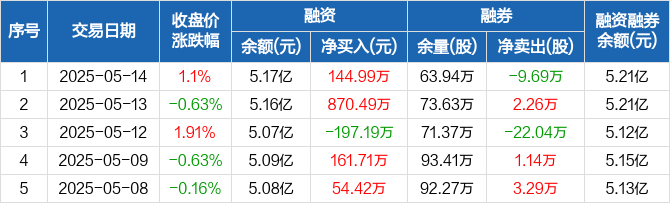 融资方面,当日融资买入1327.05万元,融资偿还1182.06万元,融资净买入144.99万元。融券方面,融券卖出6500股,融券偿还10.34万股,融券余量63.94万股,融券余额411.13万元。融资融券余额合计5.21亿元。