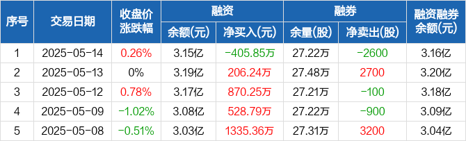 陕建股份融资融券信息显示,2025年5月14日融资净偿还405.85万元;融资余额3.15亿元,较前一日下降1.28%。