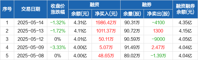 融资方面,当日融资买入4548.91万元,融资偿还2562.49万元,融资净买入1986.42万元,连续7日净买入累计3673.36万元。融券方面,融券卖出2000股,融券偿还6100股,融券余量90.31万股,融券余额406.4万元。融资融券余额合计4.35亿元。