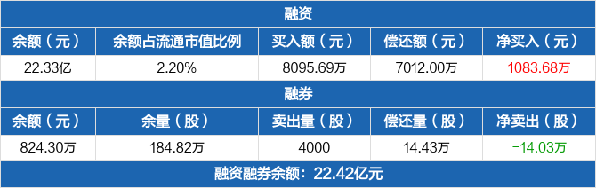 融资方面,当日融资买入8095.69万元,融资偿还7012万元,融资净买入1083.68万元,连续5日净买入累计1.51亿元。融券方面,融券卖出4000股,融券偿还14.43万股,融券余量184.82万股,融券余额824.3万元。融资融券余额合计22.42亿元。