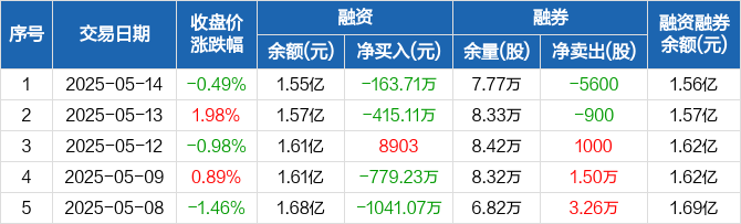 融资方面,当日融资买入1305.14万元,融资偿还1468.85万元,融资净偿还163.71万元。融券方面,融券卖出3000股,融券偿还8600股,融券余量7.77万股,融券余额79.49万元。融资融券余额合计1.56亿元。