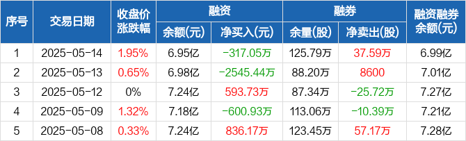 浙商银行融资融券信息显示,2025年5月14日融资净偿还317.05万元;融资余额6.95亿元,较前一日下降0.45%。