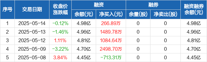 融资方面,当日融资买入3374.13万元,融资偿还3107.24万元,融资净买入266.89万元,连续4日净买入累计5340.01万元。融券方面,融券卖出0股,融券偿还0股,融券余量0股,融券余额0元。融资融券余额合计4.98亿元。