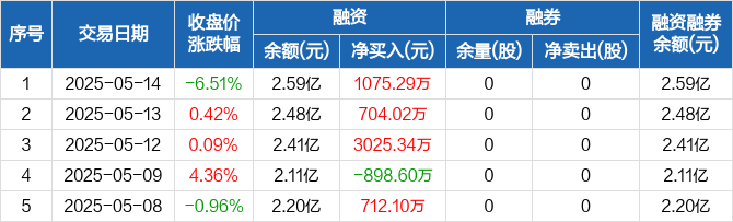 融资方面,当日融资买入6366.73万元,融资偿还5291.44万元,融资净买入1075.29万元,连续3日净买入累计4804.64万元。融券方面,融券卖出0股,融券偿还0股,融券余量0股,融券余额0元。融资融券余额合计2.59亿元。