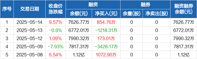 奇德新材融资融券信息显示,2025年5月14日融资净买入854.76万元;融资余额7626.77万元,较前一日增加12.62%。