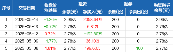 融资方面,当日融资买入3066.4万元,融资偿还1007.76万元,融资净买入2058.64万元。融券方面,融券卖出0股,融券偿还0股,融券余量200股,融券余额1094元。融资融券余额合计2.96亿元。
