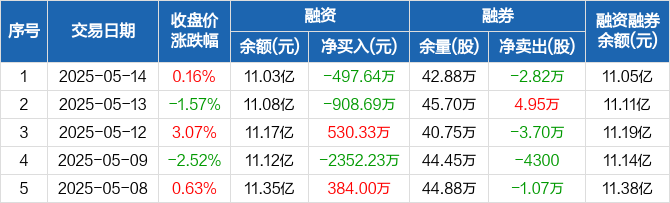 融资方面,当日融资买入3363.41万元,融资偿还3861.05万元,融资净偿还497.64万元。融券方面,融券卖出800股,融券偿还2.9万股,融券余量42.88万股,融券余额269.72万元。融资融券余额合计11.05亿元。