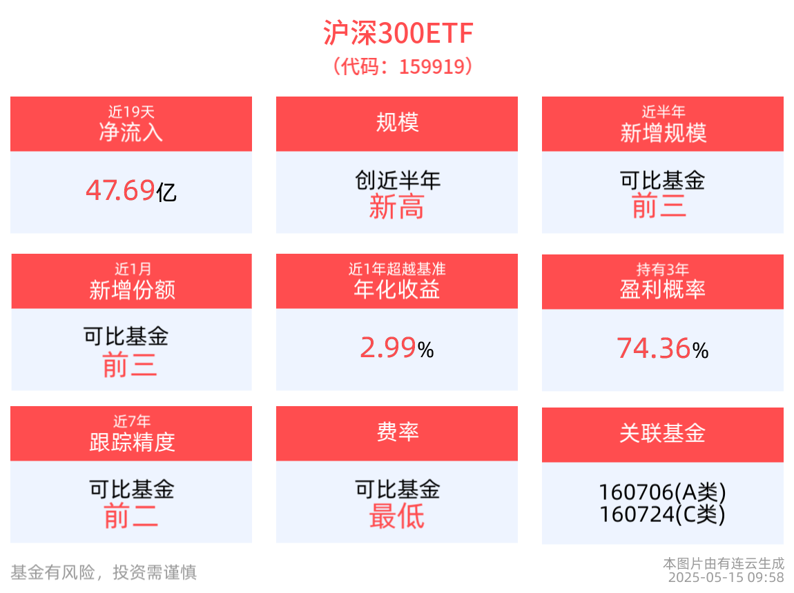 资金流入方面,沪深300ETF最新资金流入流出持平。拉长时间看,近19个交易日内,合计“吸金”47.69亿元。