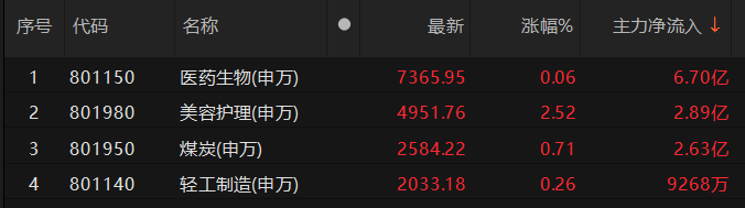 上证报中国证券网讯截至5月15日11时05分,申万一级行业板块中,主力资金净流入医药生物、美容护理、煤炭等板块,其中,医药生物板块净流入超6亿元。主力资金净流出计算机、电子、机械设备等板块,其中计算机板块净流出超60亿元。