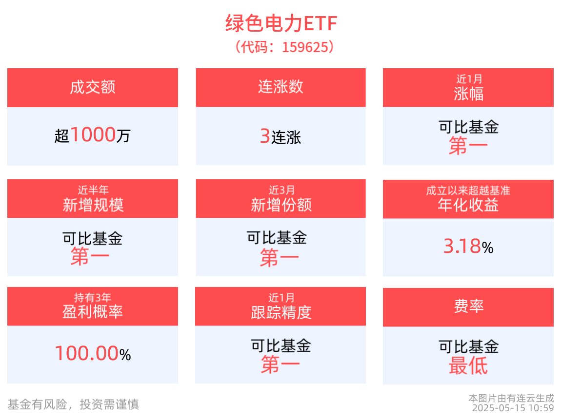 截至2025年5月15日 10:59,国证绿色电力指数上涨0.01%,成分股京运通上涨7.58%,华能国际上涨1.21%,湖南发展上涨1.09%,明星电力上涨1.05%,国电电力上涨0.88%。绿色电力ETF(159625)冲击3连涨。
