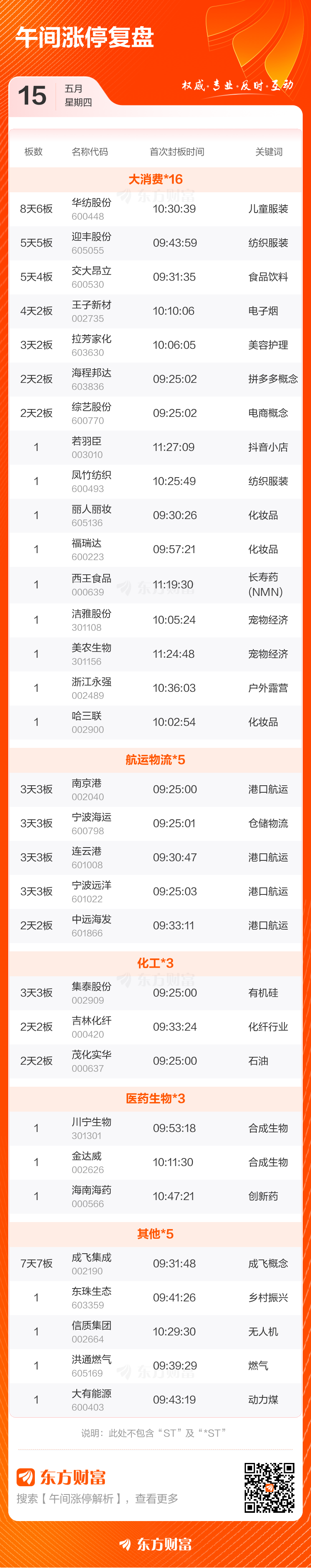 05月15日午间涨停复盘:59股涨停 华纺股份8天6板