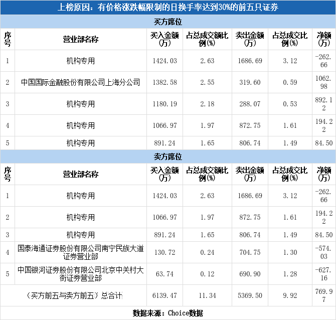 深交所2025年5月15日交易公开信息显示,长华化学因属于有价格涨跌幅限制的日换手率达到30%的前五只证券而登上龙虎榜。长华化学当日报收25.57元,涨跌幅为-9.68%,换手率38.38%,振幅9.33%,成交额5.41亿元。