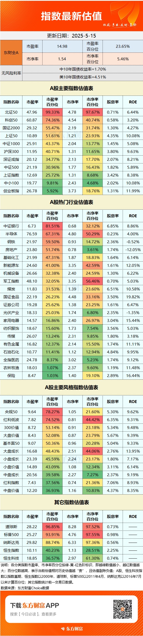 截至5月15日收盘,东方财富Choice数据显示,东财全A市盈率为14.98倍,市盈率百分位为23.65%;市净率为1.54倍,市净率百分位为5.46%。
