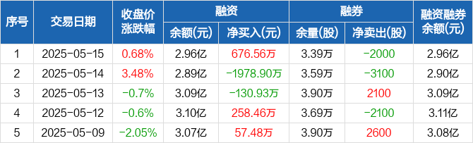 融资方面,当日融资买入4267.01万元,融资偿还3590.44万元,融资净买入676.56万元。融券方面,融券卖出800股,融券偿还2800股,融券余量3.39万股,融券余额70.11万元。融资融券余额合计2.96亿元。