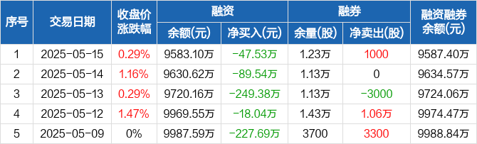 融资方面,当日融资买入130.2万元,融资偿还177.73万元,融资净偿还47.53万元,连续8日净偿还累计1729万元。融券方面,融券卖出3000股,融券偿还2000股,融券余量1.23万股,融券余额4.31万元。融资融券余额合计9587.4万元。