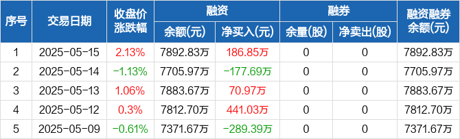 融资方面,当日融资买入1023.39万元,融资偿还836.54万元,融资净买入186.85万元。融券方面,融券卖出0股,融券偿还0股,融券余量0股,融券余额0元。融资融券余额合计7892.83万元。