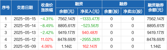 恒勃股份融资融券信息显示,2025年5月15日融资净偿还1333.47万元;融资余额7562.14万元,较前一日下降14.99%。