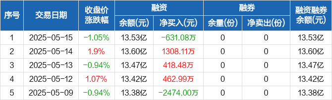 融资方面,当日融资买入2.55亿元,融资偿还2.62亿元,融资净偿还631.08万元。融券方面,融券卖出0份,融券偿还0份,融券余量0份,融券余额0元。融资融券余额合计13.53亿元。