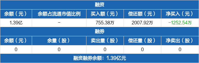 融资方面,当日融资买入755.38万元,融资偿还2007.92万元,融资净偿还1252.54万元。融券方面,融券卖出0份,融券偿还0份,融券余量0份,融券余额0元。融资融券余额合计1.39亿元。