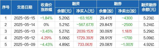 楚江新材融资融券信息显示,2025年5月15日融资净偿还63.16万元;融资余额5.2亿元,较前一日下降0.12%。