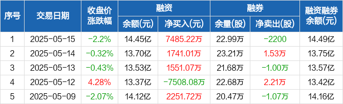 卫星化学融资融券信息显示,2025年5月15日融资净买入7485.22万元;融资余额14.45亿元,较前一日增加5.46%。