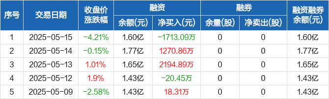 融资方面,当日融资买入2298.39万元,融资偿还4011.48万元,融资净偿还1713.09万元。融券方面,融券卖出0股,融券偿还0股,融券余量0股,融券余额0元。融资融券余额合计1.6亿元。