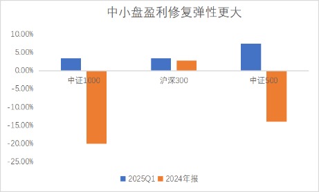 至于2025年一季报的披露,我们能看到A股盈利迎来明显修复。根据2024年年报及2025年一季报数据,沪深300/中证500/中证1000板块2024年报归母净利润增速分别为2.8%/-14.0%/-20.0%, 2025Q1单季度增速为3.3%/7.4%/3.3%。中证500/中证1000盈利增速转正,中小成长风格指数业绩表现出更大的修复力度和弹性。