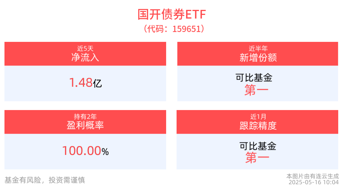 截至2025年5月16日 10:04,国开债券ETF(159651)多空胶着,最新报价106元。拉长时间看,截至2025年5月15日,国开债券ETF近1年累计上涨2.10%。